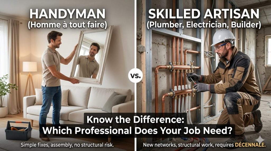 When you’re settling into your French dream home, the last thing you want to worry about is a legal maze. Most homeowners simply want a job done well, but many are unaware of the core theme of today’s guide: Know the difference: what your handyman is legally allowed to do (and what requires an artisan). There is a massive legal and insurance divide between these two roles. It isn’t always about who is better with a wrench; it’s about the specific insurance each professional carries, and understanding that distinction is what protects your home when things go wrong.